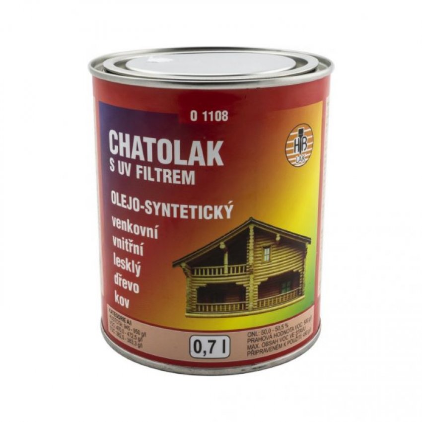 Chatolak S1108 olejosyntetický lak s velkou odolností vůči vodě, slunci, s UV filtrem. Pro nátěry starého i nového dřeva, dřevotřísky a minerálních savých podkladů vystavených působení vody a deště v exteriéru i interiéru. Vykazuje prodlouženou odolnost povětrnostním vlivům, proto je vhodný k venkovním nátěrům. Lak je vysoce lesklý, hladký a tvrdý. Obsahuje UV filtr, který zamezuje stárnutí vlivem slunečního záření.