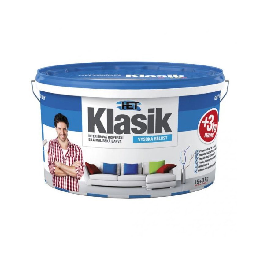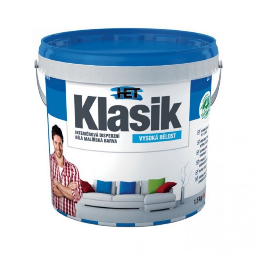 Klasik (1.5) je kvalitní disperzní interiérová barva, která se vyznačuje vysokou krycí schopností, matným vzhledem a odolností vůči otěru za sucha. Díky své paropropustnosti je ideální pro použití v obytných i komerčních prostorách, včetně míst s vyšší vlhkostí nebo sanačními omítkami.