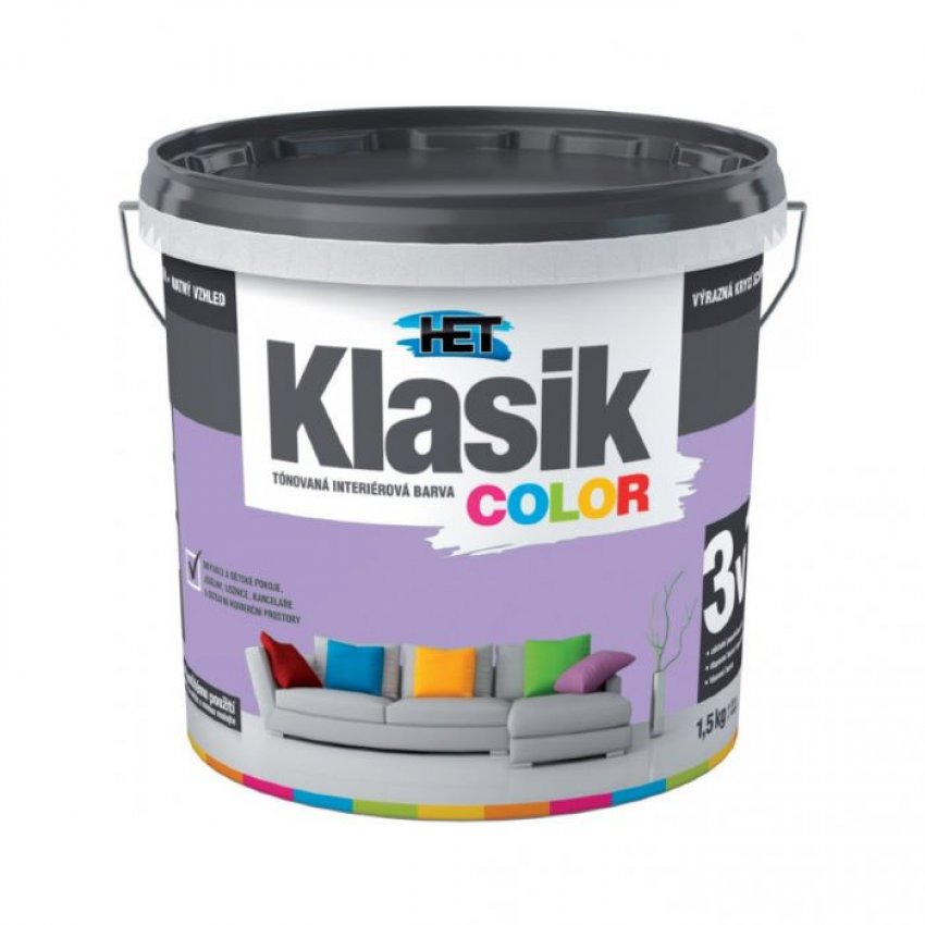 Het Klasic Color malířská tónovaná disperzní otěruvzdorná barva kterou doporučujeme pro obývací a komerční prostory, dětské pokoje, jídelny, chodby, kanceláře, prodejní prostory. Vhodná k nátěrům minerálních, sádrových a sanačních omítek, zdiva, betonových panelů a monolitů, sádrokartonových, sádrovláknitých a dřevovláknitých desek, papírových tapet k tomu určených, tapet ze skelných vláken apod. Okamžitá aplikace tónované barvy, výrazná krycí schopnost a roztíratelnost, matný vzhled, odolnost vůči otěru za sucha, vynikající paropropustnost, vhodná k nátěrům omítek sanačních systémů. 16 barevných odstínů. Obsah balení 1,5kg.