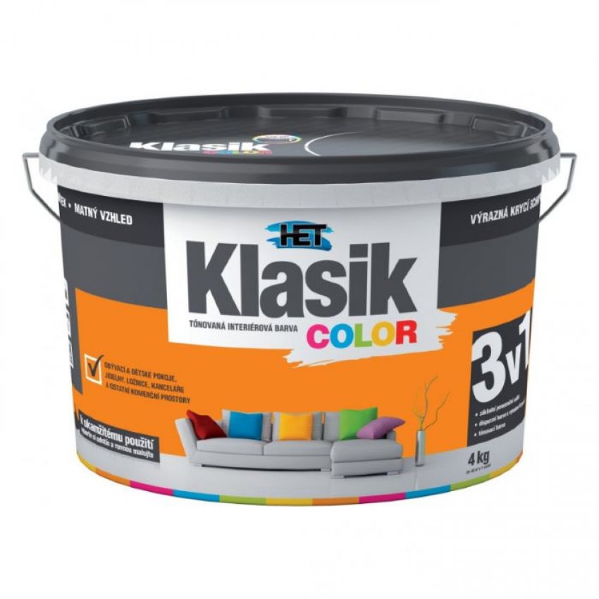 Het Klasic Color malířská tónovaná disperzní otěruvzdorná barva kterou doporučujeme pro obývací a komerční prostory, dětské pokoje, jídelny, chodby, kanceláře, prodejní prostory. Vhodná k nátěrům minerálních, sádrových a sanačních omítek, zdiva, betonových panelů a monolitů, sádrokartonových, sádrovláknitých a dřevovláknitých desek, papírových tapet k tomu určených, tapet ze skelných vláken apod. Okamžitá aplikace tónované barvy, výrazná krycí schopnost a roztíratelnost, matný vzhled, odolnost vůči otěru za sucha, vynikající paropropustnost, vhodná k nátěrům omítek sanačních systémů. 16 barevných odstínů. Obsah balení 4kg.