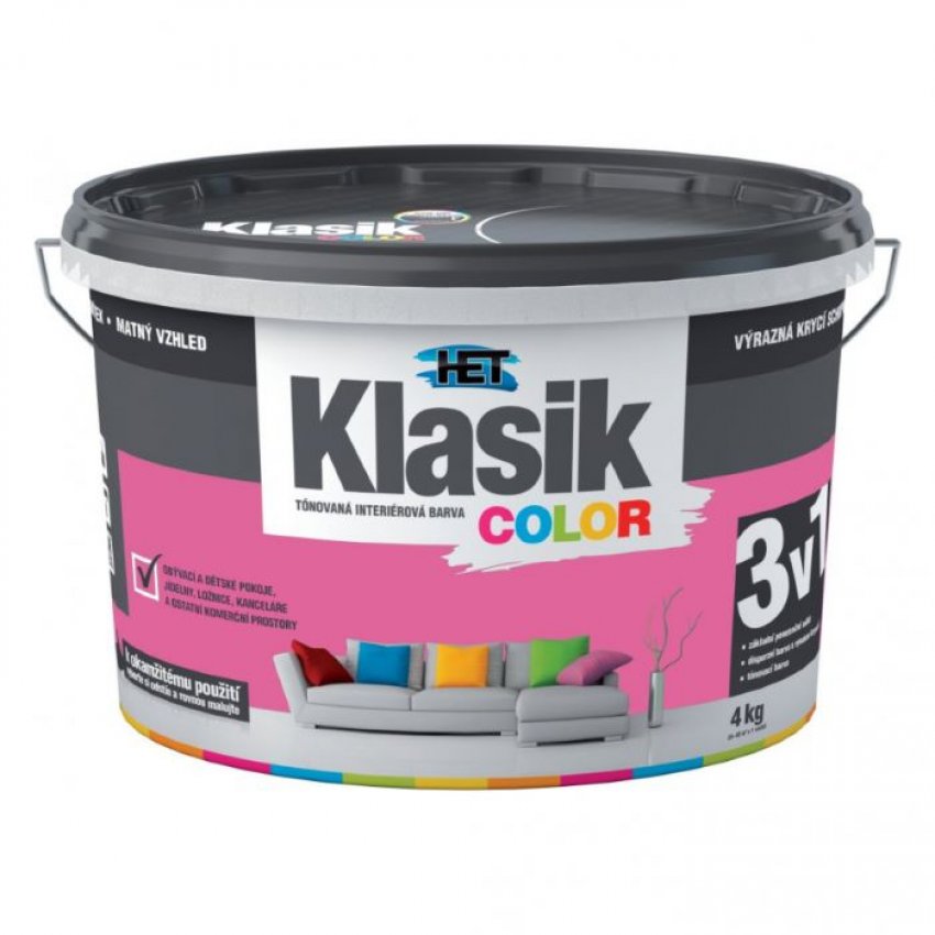 Het Klasic Color malířská tónovaná disperzní otěruvzdorná barva kterou doporučujeme pro obývací a komerční prostory, dětské pokoje, jídelny, chodby, kanceláře, prodejní prostory. Vhodná k nátěrům minerálních, sádrových a sanačních omítek, zdiva, betonových panelů a monolitů, sádrokartonových, sádrovláknitých a dřevovláknitých desek, papírových tapet k tomu určených, tapet ze skelných vláken apod. Okamžitá aplikace tónované barvy, výrazná krycí schopnost a roztíratelnost, matný vzhled, odolnost vůči otěru za sucha, vynikající paropropustnost, vhodná k nátěrům omítek sanačních systémů. 16 barevných odstínů. Obsah balení 4kg.