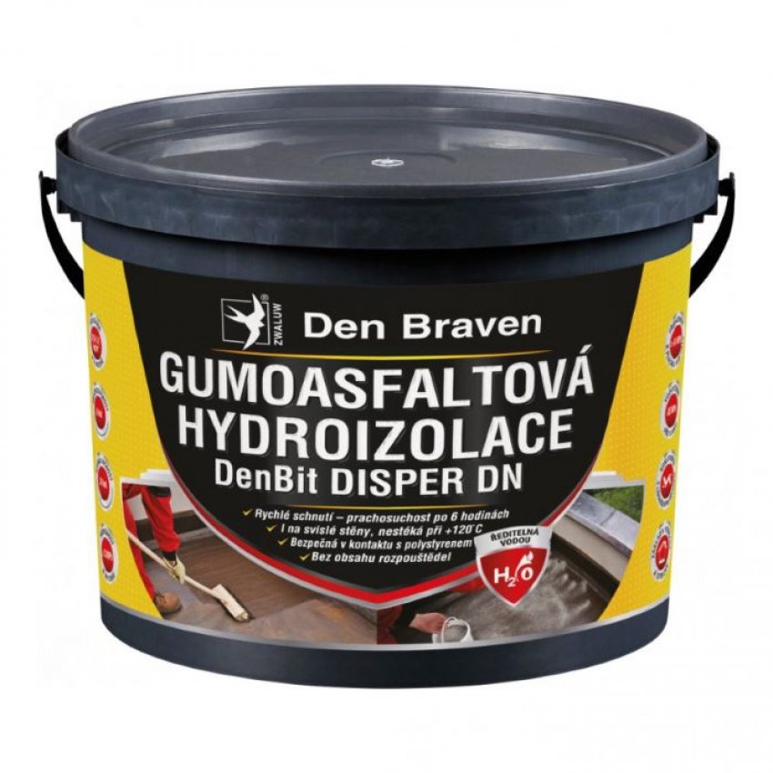 Disperze asfaltů modifikovaných syntetickým kaučukem k použití na suché a mírně vlhké podklady. Díky tixotropním vlastnostem je možno nanášet DenBit DISPER DN na podklad s libovolným sklonem. Renovování a konzervování střešních krytin, provádění bezespárých střešních krytin vyztužených technickými tkaninami, provádění protivlhkostních izolací hrubých podlah sklepů, garáží, teras, balkónů a k ochraně podzemních částí budov před vlhkostí. Druh podkladu: beton, cementové, cemento-vápenné omítky, eternit, lepenka a podobné materiály na bitumenové bázi a podklady ošetřené penetrací DenBit DISPER AS.