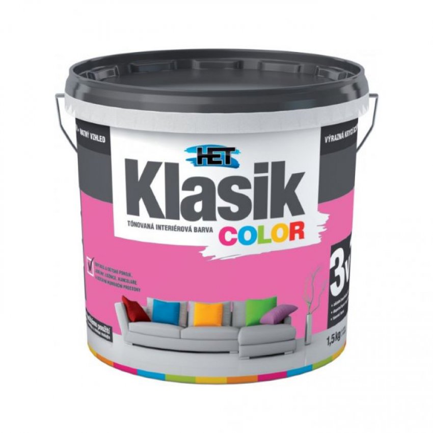 Het Klasic Color malířská tónovaná disperzní otěruvzdorná barva kterou doporučujeme pro obývací a komerční prostory, dětské pokoje, jídelny, chodby, kanceláře, prodejní prostory. Vhodná k nátěrům minerálních, sádrových a sanačních omítek, zdiva, betonových panelů a monolitů, sádrokartonových, sádrovláknitých a dřevovláknitých desek, papírových tapet k tomu určených, tapet ze skelných vláken apod. Okamžitá aplikace tónované barvy, výrazná krycí schopnost a roztíratelnost, matný vzhled, odolnost vůči otěru za sucha, vynikající paropropustnost, vhodná k nátěrům omítek sanačních systémů. 16 barevných odstínů. Obsah balení 1,5kg.