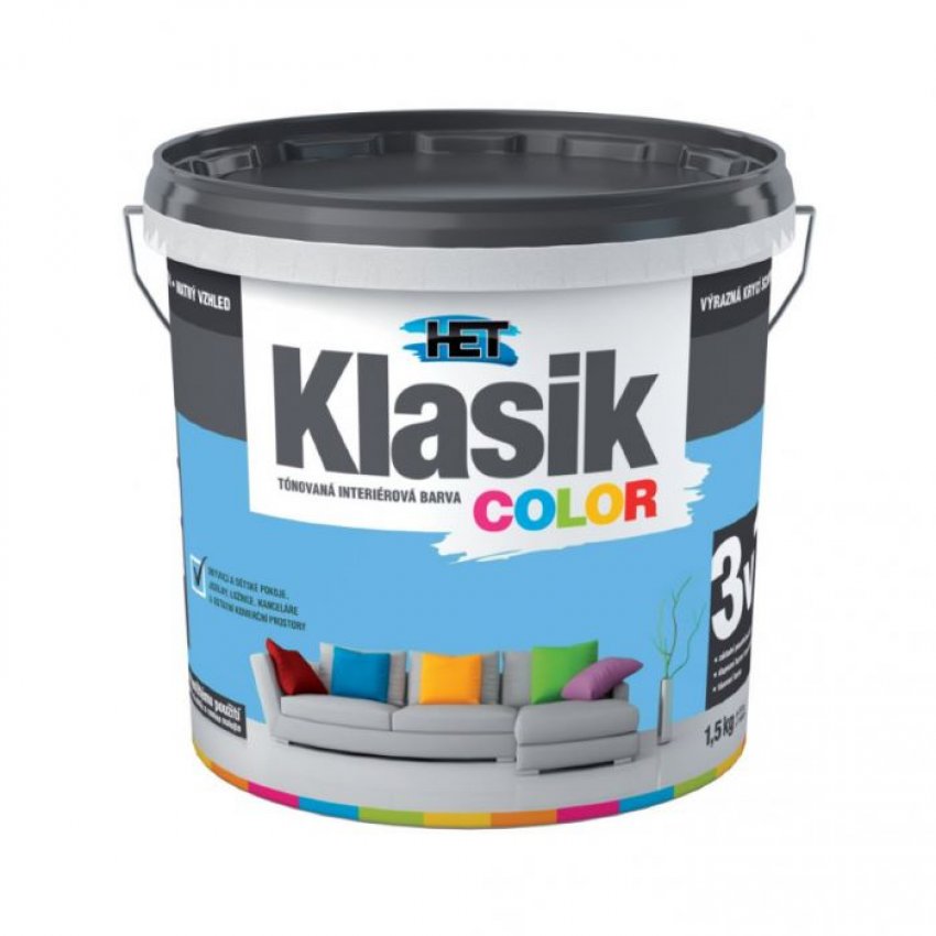 Het Klasic Color malířská tónovaná disperzní otěruvzdorná barva kterou doporučujeme pro obývací a komerční prostory, dětské pokoje, jídelny, chodby, kanceláře, prodejní prostory. Vhodná k nátěrům minerálních, sádrových a sanačních omítek, zdiva, betonových panelů a monolitů, sádrokartonových, sádrovláknitých a dřevovláknitých desek, papírových tapet k tomu určených, tapet ze skelných vláken apod. Okamžitá aplikace tónované barvy, výrazná krycí schopnost a roztíratelnost, matný vzhled, odolnost vůči otěru za sucha, vynikající paropropustnost, vhodná k nátěrům omítek sanačních systémů. 16 barevných odstínů. Obsah balení 1,5kg.