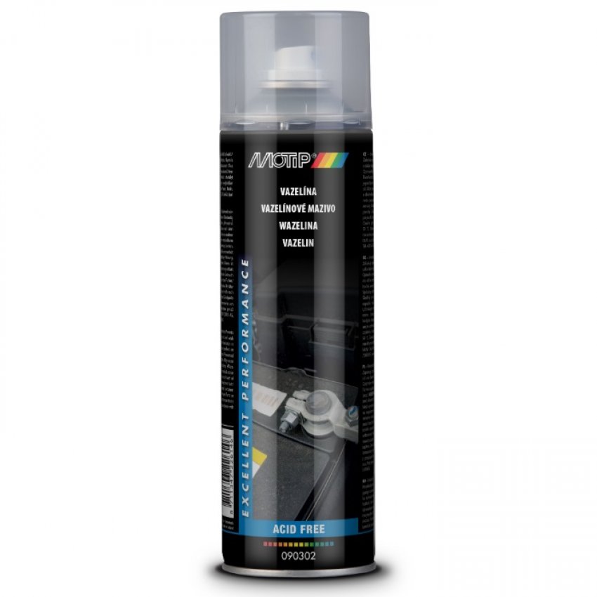 Mazací a ochranný prostředek proti korozi. Díky speciálnímu složení je univerzálním prostředkem pro veškeré kluzné plochy, antény a šroubová spojení, části zámků a ochranou proti oxidaci elektrických kontaktů. Vazelínový sprej je vodoodpudivý, má neutrální pH a je odolný vůči vlivům počasí a slabým kyselinám a bázím. Nabízí skvělou ochranu proti korozi a chrání před opotřebením a slepením. Je odolný vůči teplotám mezi -30°C a +160°C.