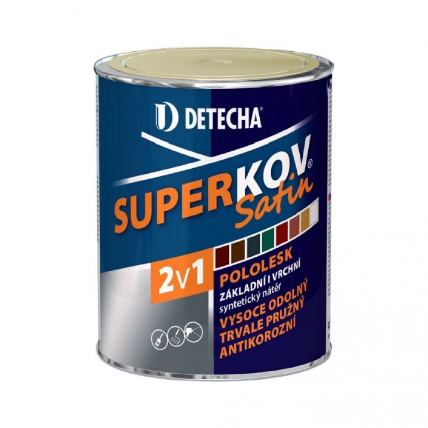 Detecha Superkov Satin 2v1 základní i vrchní barva na kov je nově vyvinutá nátěrová hmota hedvábně lesklého vzhledu v atraktivní moderní barevné škále. Jedná se o základní i vrchní nátěr v jednom, který poskytuje kromě atraktivního vzhledu také dokonalou antikorozní ochranu. Spolehlivě působí proti veškerým povětrnostním vlivům včetně UV záření. Je vysoce pružný, zvládá výrazné teplotní výkyvy. K dlouhodobé ochraně (až 8 let) postačí 2 vrstvy Superkovu Satin bez předchozího základního nátěru.
