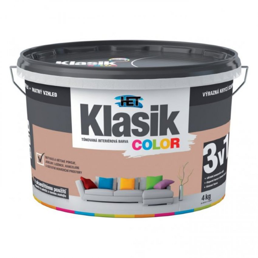 Het Klasic Color malířská tónovaná disperzní otěruvzdorná barva kterou doporučujeme pro obývací a komerční prostory, dětské pokoje, jídelny, chodby, kanceláře, prodejní prostory. Vhodná k nátěrům minerálních, sádrových a sanačních omítek, zdiva, betonových panelů a monolitů, sádrokartonových, sádrovláknitých a dřevovláknitých desek, papírových tapet k tomu určených, tapet ze skelných vláken apod. Okamžitá aplikace tónované barvy, výrazná krycí schopnost a roztíratelnost, matný vzhled, odolnost vůči otěru za sucha, vynikající paropropustnost, vhodná k nátěrům omítek sanačních systémů. 16 barevných odstínů. Obsah balení 4kg.