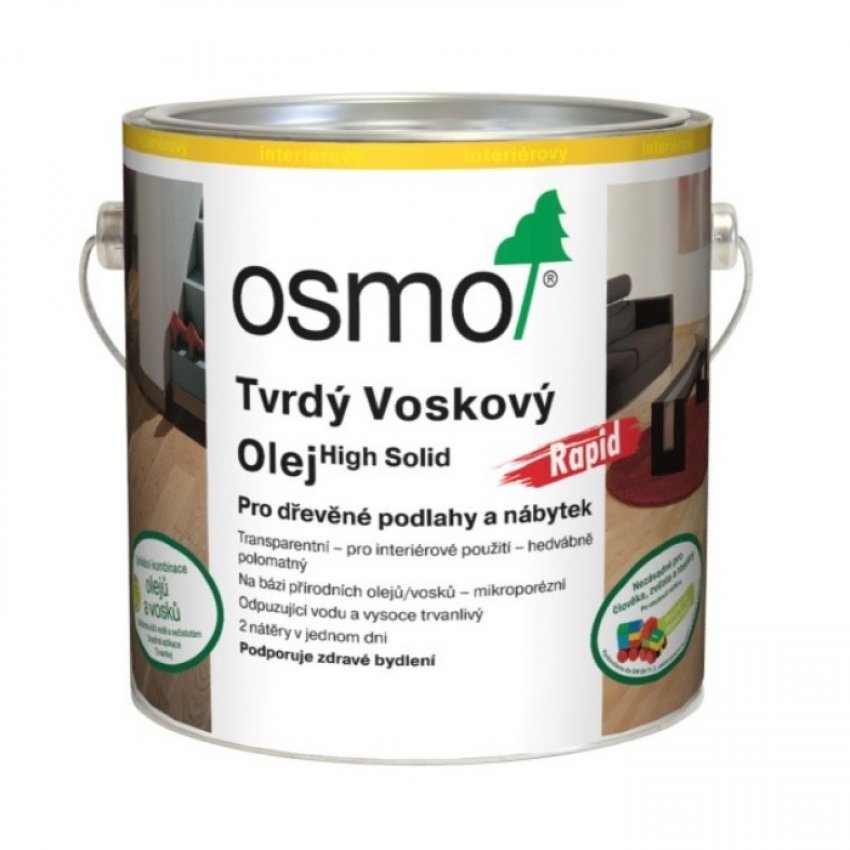 Osvědčený Tvrdý voskový olej v rychle schnoucí variantě – 2 nátěry proveditelné v 1 den. Bezbarvý, k použití uvnitř. Obzvláště se doporučuje pro masivní podlahové palubky, selská prkna, parketové podlahy, OSB a korkové podlahy. Tvrdý voskový olej Rapid zesiluje barevnou intenzitu přírodního vzhledu povrchu dřeva, je odolný vůči ošlapání, odpuzuje vodu a nečistoty, je trvale zatížitelný a mimořádně odolný. Počet nátěrů: u dřeva bez povrchové úpravy dva nátěry, v případě renovace stačí zpravidla jeden nátěr na očištěný povrch – bez obrušování. 1l stačí při jednom nátěru na cca 24m2.