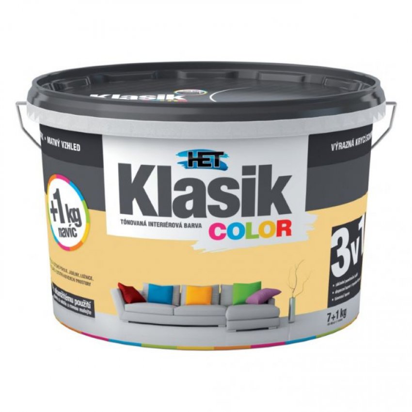 Het Klasic Color malířská tónovaná disperzní otěruvzdorná barva kterou doporučujeme pro obývací a komerční prostory, dětské pokoje, jídelny, chodby, kanceláře, prodejní prostory. Vhodná k nátěrům minerálních, sádrových a sanačních omítek, zdiva, betonových panelů a monolitů, sádrokartonových, sádrovláknitých a dřevovláknitých desek, papírových tapet k tomu určených, tapet ze skelných vláken apod. Okamžitá aplikace tónované barvy, výrazná krycí schopnost a roztíratelnost, matný vzhled, odolnost vůči otěru za sucha, vynikající paropropustnost, vhodná k nátěrům omítek sanačních systémů. 16 barevných odstínů. Obsah balení 7+1kg.