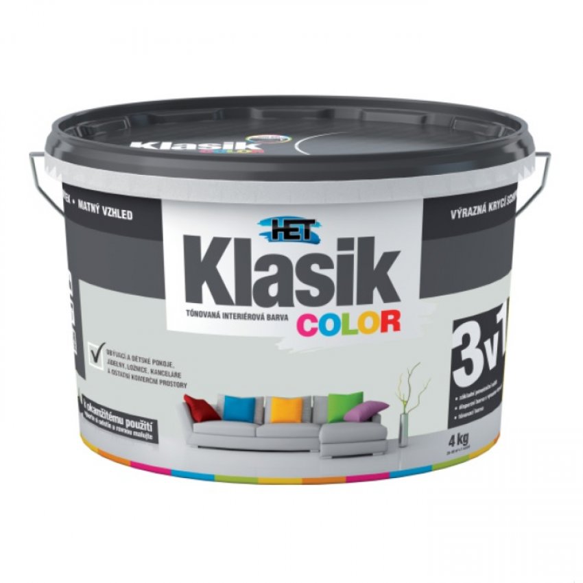 Het Klasic Color malířská tónovaná disperzní otěruvzdorná barva kterou doporučujeme pro obývací a komerční prostory, dětské pokoje, jídelny, chodby, kanceláře, prodejní prostory. Vhodná k nátěrům minerálních, sádrových a sanačních omítek, zdiva, betonových panelů a monolitů, sádrokartonových, sádrovláknitých a dřevovláknitých desek, papírových tapet k tomu určených, tapet ze skelných vláken apod. Okamžitá aplikace tónované barvy, výrazná krycí schopnost a roztíratelnost, matný vzhled, odolnost vůči otěru za sucha, vynikající paropropustnost, vhodná k nátěrům omítek sanačních systémů. 16 barevných odstínů. Obsah balení 4kg.