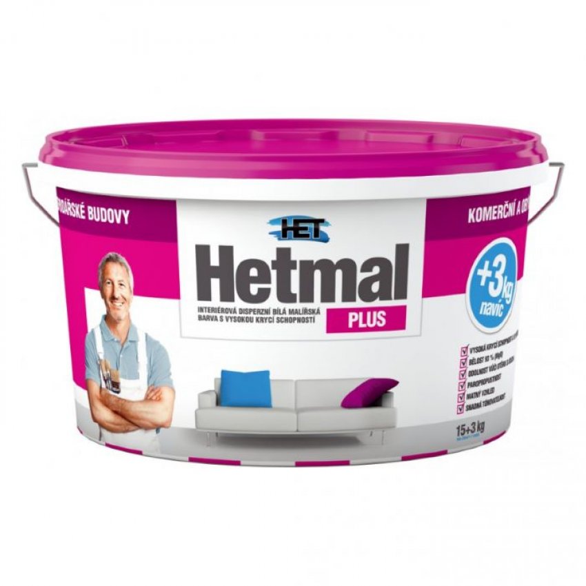 Interiérová disperzní bílá krycí barva Het Hetmal Plus s vysokou krycí schopností - doporučujeme pro komerční a obývací prostory, kanceláře, školy, chodby,průmyslové aplikace. Het Hetmal Plus je k vnitřním nátěrům stěn a stropů, vápenných a vápenocementových omítek, betonových panelů a monolitů, papírových tapet k tomu určených, apod. Barva je vhodná k přetírání starých nosných vrstev interiérových barev. Výrobek splňuje požadavky pro nátěry povrchů, které mohou přicházet do nepřímého a přímého nahodilého styku s potravinami. Nátěr vytváří matný, paropropustný povrch, který je odolný vůči standardní vlhkosti v místnostech a odolný vůči otěru suchou látkou. Natřený povrch nesmí být ve stálém kontaktu s vodou a nesmí být vystaven kondenzující vlhkosti. Zaschlý nátěr krátkodobě odolá teplotě okolo 70 °C. Barva Het Hetmal Plus je vhodná pro výmalbu obývacích a komerčních prostor, chodeb, kanceláří, škol, průmyslových prostor apod. Zvýšená bělost 93 % (MgO), vysoká vydatnost, matný vzhled, odolnost vůči otěru za sucha, paropropustnost, snadná tónovatelnost.