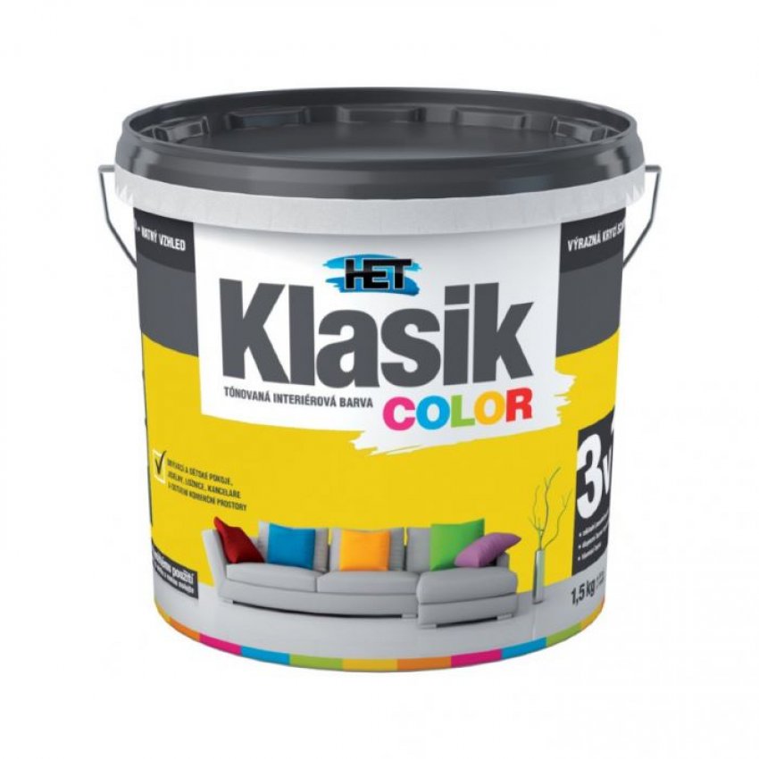 Het Klasic Color malířská tónovaná disperzní otěruvzdorná barva kterou doporučujeme pro obývací a komerční prostory, dětské pokoje, jídelny, chodby, kanceláře, prodejní prostory. Vhodná k nátěrům minerálních, sádrových a sanačních omítek, zdiva, betonových panelů a monolitů, sádrokartonových, sádrovláknitých a dřevovláknitých desek, papírových tapet k tomu určených, tapet ze skelných vláken apod. Okamžitá aplikace tónované barvy, výrazná krycí schopnost a roztíratelnost, matný vzhled, odolnost vůči otěru za sucha, vynikající paropropustnost, vhodná k nátěrům omítek sanačních systémů. 16 barevných odstínů. Obsah balení 1,5kg.