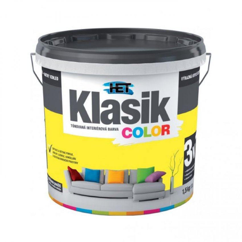 Het Klasic Color malířská tónovaná disperzní otěruvzdorná barva kterou doporučujeme pro obývací a komerční prostory, dětské pokoje, jídelny, chodby, kanceláře, prodejní prostory. Vhodná k nátěrům minerálních, sádrových a sanačních omítek, zdiva, betonových panelů a monolitů, sádrokartonových, sádrovláknitých a dřevovláknitých desek, papírových tapet k tomu určených, tapet ze skelných vláken apod. Okamžitá aplikace tónované barvy, výrazná krycí schopnost a roztíratelnost, matný vzhled, odolnost vůči otěru za sucha, vynikající paropropustnost, vhodná k nátěrům omítek sanačních systémů. 16 barevných odstínů. Obsah balení 1,5kg.