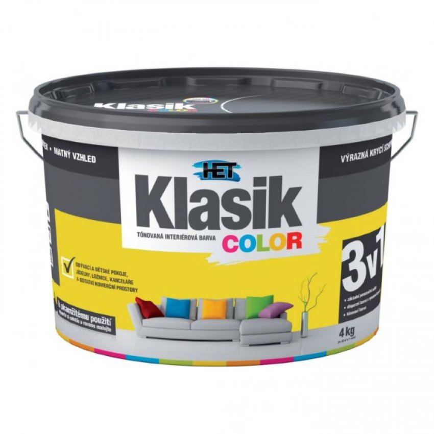 Het Klasic Color malířská tónovaná disperzní otěruvzdorná barva kterou doporučujeme pro obývací a komerční prostory, dětské pokoje, jídelny, chodby, kanceláře, prodejní prostory. Vhodná k nátěrům minerálních, sádrových a sanačních omítek, zdiva, betonových panelů a monolitů, sádrokartonových, sádrovláknitých a dřevovláknitých desek, papírových tapet k tomu určených, tapet ze skelných vláken apod. Okamžitá aplikace tónované barvy, výrazná krycí schopnost a roztíratelnost, matný vzhled, odolnost vůči otěru za sucha, vynikající paropropustnost, vhodná k nátěrům omítek sanačních systémů. 16 barevných odstínů. Obsah balení 4kg.
