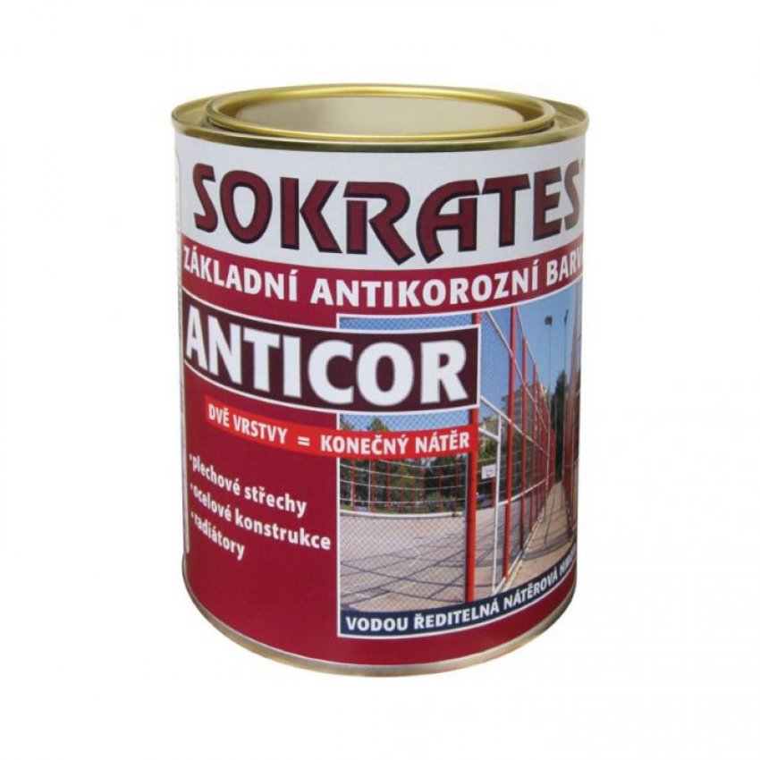 SOKRATES ANTICOR BÍLÁ je základní, ale i vrchní, antikorozní, vodou ředitelná, krycí nátěrová hmota, vhodná pro venkovní i vnitřní nátěry kovových podkladů, jako je ocelový, pozinkovaný, galvanizovaný, hliníkový povrch. Poskytuje pružné a odolné filmy. Antikorozní základní barva na kov a železné podklady, pozinkované, lehké kovy a měď s dobrou přilnavostí, odolností na vodu a velmi dobrým antikorozním účinkem. Obsahuje inhibitor bleskové koroze. Ve dvou nátěrech může zůstat konečným nátěrem. Jako vrchní nátěr mohou být použity barvy Sokrates Colour, email Professional, Titan a další krycí barvy. Barva je odolná proti zpuchýřování, je vhodná k použití na plechové střechy, oplechování budov, okapové svody, ocelové konstrukce apod. Obsah balení 0,7kg.