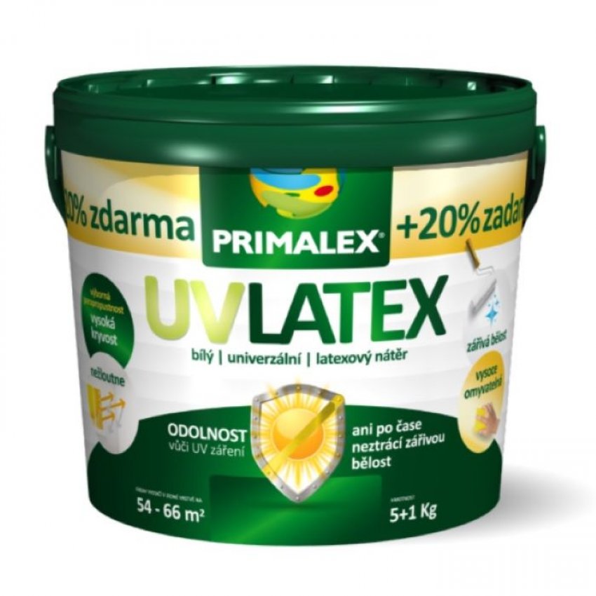 Primalex UV Latex je matný, zářivě bílý (nad 90% BaSO4) nátěr s vysokou odolností vůči oděru za mokra a omyvatelností (třída 2). Má vynikající paropropustnost a kryvost. Nátěr nežloutne, snadno se aplikuje a díky svému nezávadnému složení je velmi šetrný k životnímu prostředí.